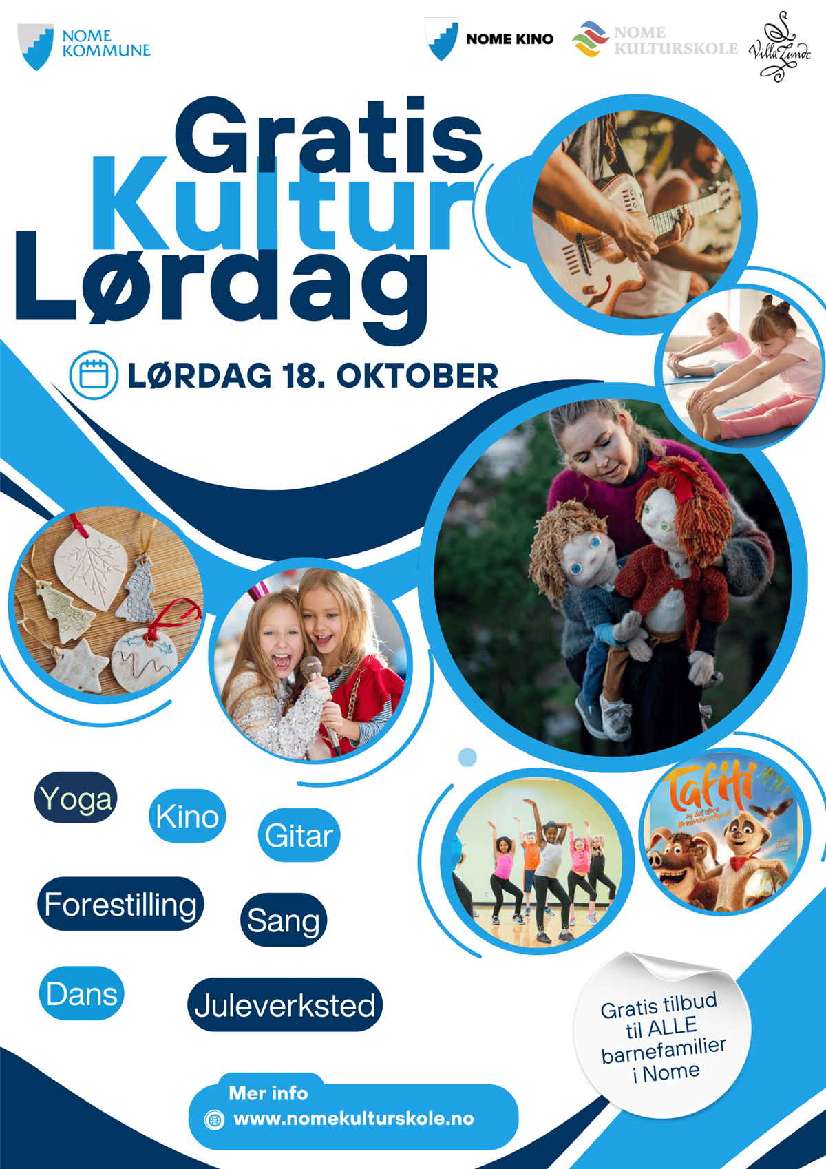 Bli med på gratis kultur-lørdag 18. oktober! Gratis kulturlørdag er et gratis tilbud til alle barnefamilier i Nome, og er et sted for å være sammen med venner og familie, eller kanskje bli kjent med noen nye i kommunen vår.