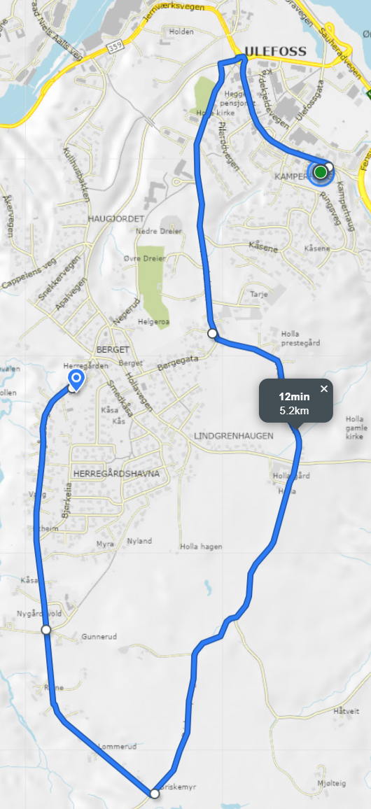 Alternativ 1 viser kjøring opp «nyebakken» videre om Holla Gård via Briskemyr inn på Herregårdsvegen som følges til barnehagene.