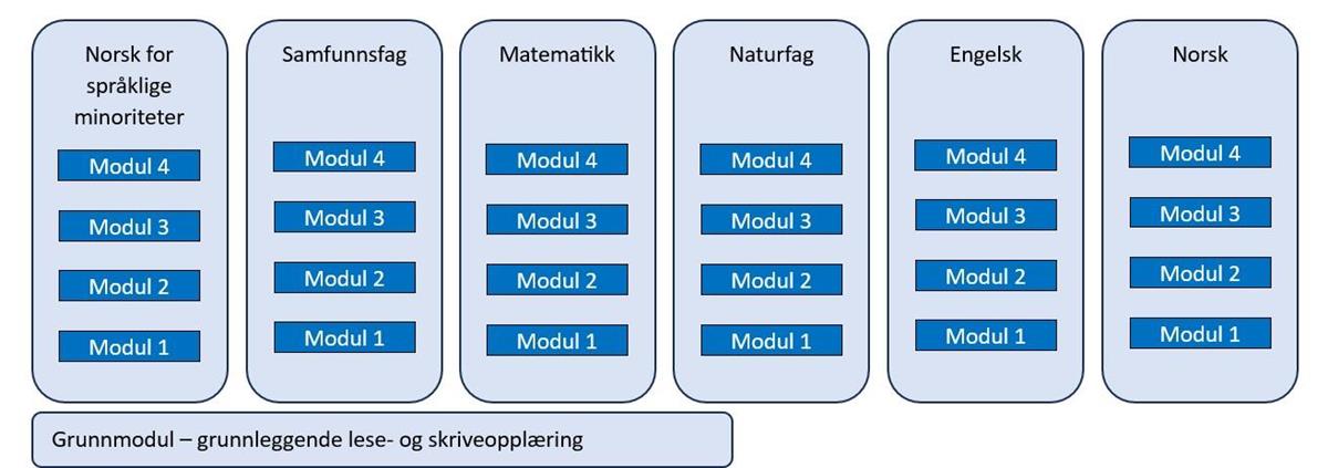 Les mer på HK-dir https://hkdir.no/voksenopplaering/modulstrukturert-opplaering-for-voksne/hva-er-modulstrukturert-opplaering